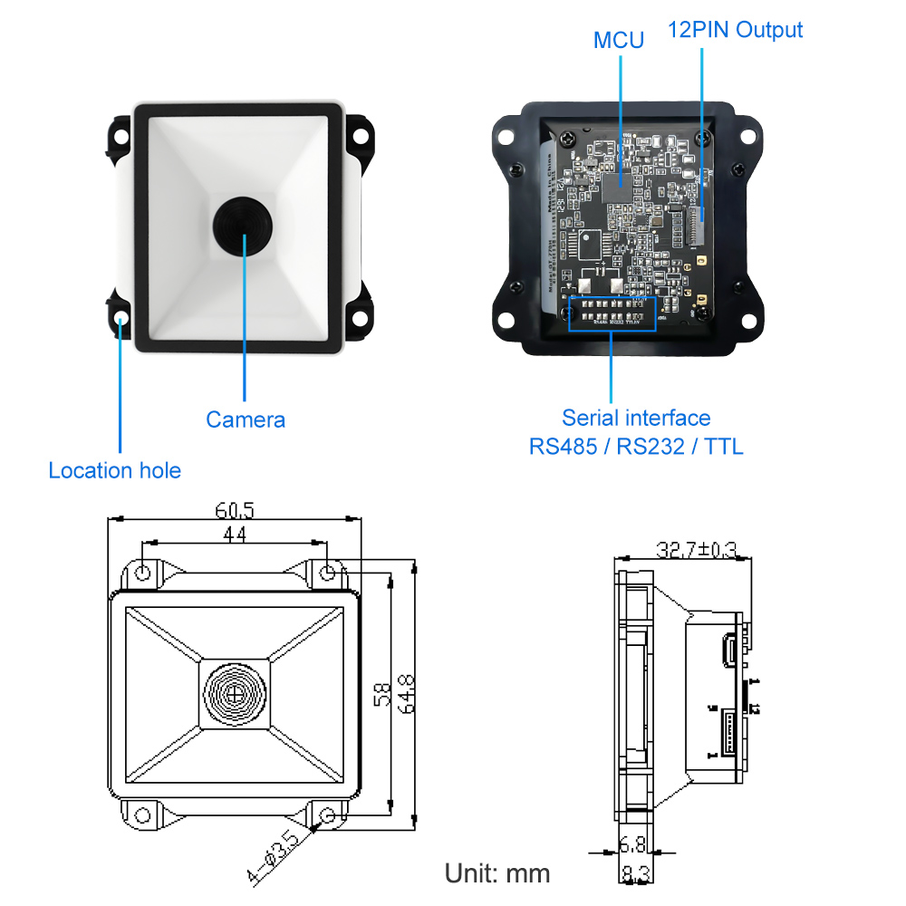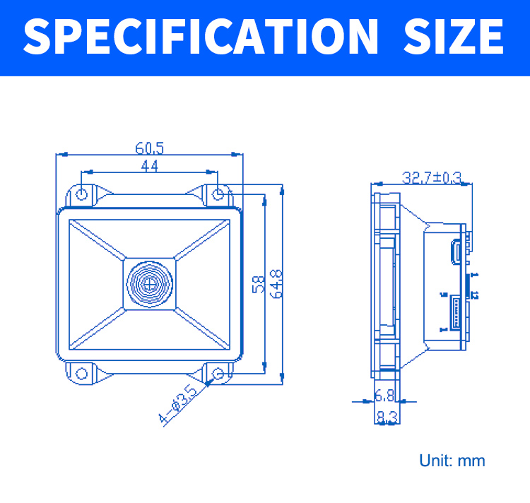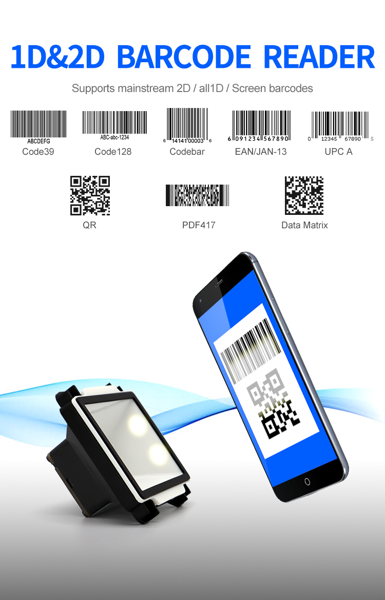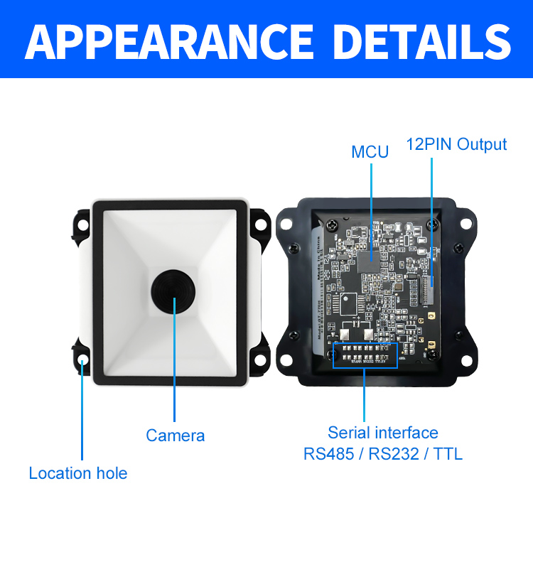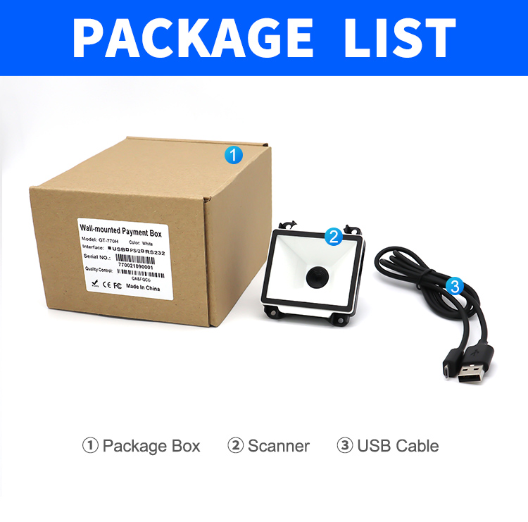 | Depth of field | QR 10.83mil (8 bytes) 2cm - 6cm Code128 5.83mil (15 bytes) 3.5cm - 5cm Code28 10.83mil (16 bytes) 5cm - 12cm Wechat payment one-dimensional code 3cm - 20cm Wechat payment QR code 3cm - 30cm | ||||||